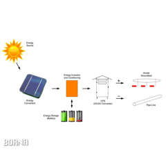 در چنین مواقعی استفاده از سامانه‌های حفاظت کاتدی فتوولتائیک مناسب‌ترین راه حل برای رفع این مشکل است که علاوه بر تأمین جریان مورد نیاز در حفاظت کاتدی، منبع انرژی پاک محسوب شده و از آلودگی محیط زیست چلوگیری می‌کند. با استفاده از یک کنورتور DC/DC و بدون اتلاف انرژی، برق تولید شده توسط سلول‌های خورشیدی به یک برق یکسو (DC) قابل کنترل و تنظیم تبدیل شده و خروجی کنورتور به سامانه تحت حفاظت اعمال می‌گردد. استفاده از باتری این ضریب اطمینان را برای سامانه بوجود می‌آورد که در شب‌ها و روزهای ابری انرژی لازم تأمین شده و مشکلی برای استمرار عملکرد سامانه حفاظت کاتدی بوجود نیاید.